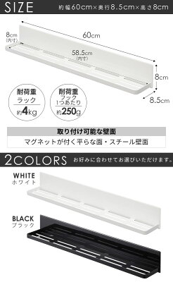 マグネットバスルームラック タワー(tower) / 山崎実業 YAMAZAKI 仕様 サイズ:約幅60cm×奥行8.5cm×高さ8cm 棚内寸:約幅58.5cm×奥行8cm 耐荷重:ラック/約4kg、フック1つあたり/約250g 取り付け可能な壁面:マグネット付く平らな面・スチール壁面 材 質:本体/スチール(ユニクロメッキ+粉体塗装)、マグネット、滑り止め/シリコーン 商品重量:約1.2kg 付属品:フック×3 デザイン:日本 生産国:中国 ※WEB上のため、実物と画像の色が、多少違う点がございます。