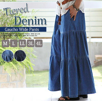 ■カラー「2color」ブルー、ネイビー ■素材:綿100% ■サイズ「平置き実寸」M・L・LL・3L・4L 「Mサイズ」ウエスト周り(総ゴム)約54~86cm、ヒップ幅:約51cm、股上:約35cm、股下:約59cm、裾幅:57.5cm 「Lサイズ」ウエスト周り(総ゴム)約60~90cm、ヒップ幅:約55cm、股上:約35cm、股下:約59cm、裾幅:64cm 「LLサイズ」ウエスト周り(総ゴム)約66~96cm、ヒップ幅:約60cm、股上:約37cm、股下:約59cm、裾幅:68.5cm 「3Lサイズ」ウエスト周り(総ゴム)約70~100cm、ヒップ幅:約64cm、股上:約38cm、股下:約59cm、裾幅:74cm 「4Lサイズ」ウエスト周り(総ゴム)約80~106cm、ヒップ幅:約68cm、股上:約40cm、股下:約59cm、裾幅:82cm 商品カテゴリ:【デニム】3段ティアードガウチョパンツ ティアード デニム ウエストゴム 夏 春物 カジュアル ボトムス パンツ ずぼん ズボン フレアパンツ フレアーパンツ ガウチョパンツ ワイドパンツ フルレングス ロングパンツ スカンツ スカーチョ 大きいサイズ レディース 20代 30代 40代 50代 女子会 定番 人気 流行 トレンド 流行り 大人 美人 着痩せ 体型カバー 着回し 華奢見せ 可愛い こなれ 細見せ お洒落 伸縮 大人可愛い きれいめ ラフ シンプル ナチュラル ぽっちゃり ニュアンス ゆる ルームウェア おうち時間 おうち服 おうちふく 体型カバー カバー ワンマイル ワンマイルウェア プチプラ Basic style ベーシックスタイル 送料無料仕様 この商品の特徴は? スカート見えするボリューム感が魅力 段々になったティアードデザインがトレンドライクなガウチョパンツ。